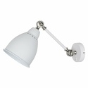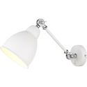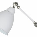оригинальный светильник бра. отлично будет смотреться в помещениях оформленных в стиле \"техно\" или \"loft\". конструкция осветительного устройства состоит из настенной накладки круглой формы, кронштейна и плафона конусообразной формы. особую привлекательность изделию предают 2 шарнирных узла в местах сочленения деталей, которые позволяют производить регулировку положения. материал арматуры – металл. поверхность матовая. цвет белый. источник света – лампа накаливания мощностью 60w.