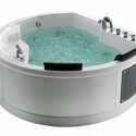Материал: акрил • Расположение: отдельно стоящая • Форма: нестандартная • Количество мест: двухместная • Гидромассаж: есть, 11 форсунок • Аэромассаж: есть • Озонирование: есть • Подсветка: есть • Комфорт: подголовник • Смеситель в комплекте: есть • Размеры (ДxШxВ): 185x183x74 см