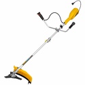 Двигатель: электрический, тип триммера: переносной, мощность электродвигателя: 1400 Вт, режущий элемент триммера: леска и нож, ширина скашивания: 42 см, конструкция штанги: прямая, плечевой ремень, количество колес: нет
