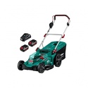 роторная газонокосилка • аккумуляторный двигатель • 36 В • аккумулятор в комплекте • ширина скашивания: 43 см • мягкий травосборник 55 л